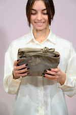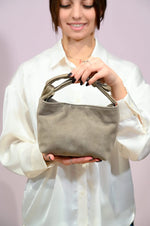 Perfetta per serate, uscite informali o come borsetta aggiuntiva, questa mini bag in pelle scamosciata grigio talpa è un accessorio versatile che completa ogni look con un tocco di eleganza discreta.