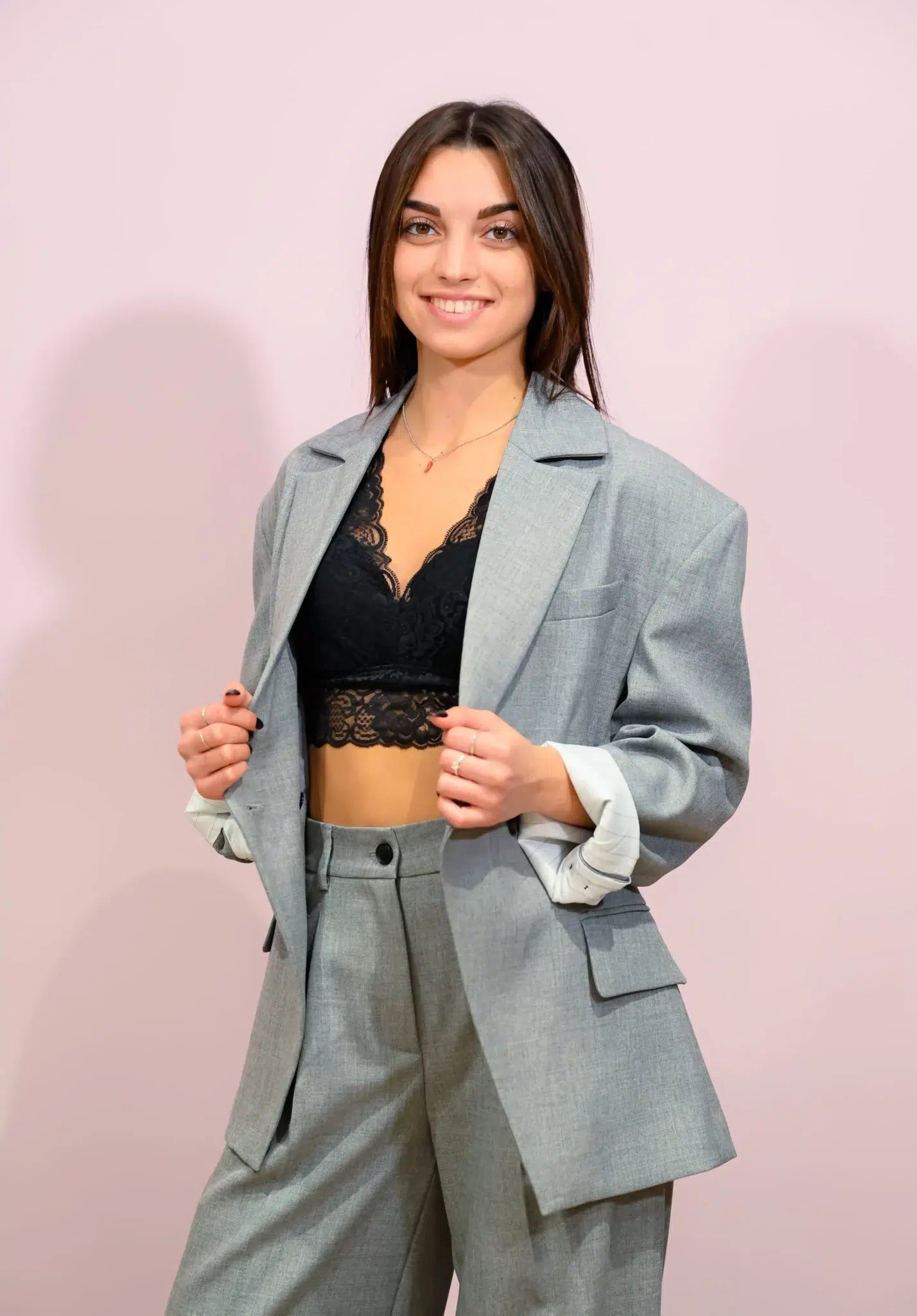 Scopri la Giacca Over Grisaglia Rue8squit, un capo esclusivo dal design moderno e strutturato. Realizzata in tessuto grisaglia grigio, questa giacca presenta un taglio a trapezio che conferisce una silhouette over, perfetta per outfit di tendenza. Le spalline strutturate aggiungono un tocco elegante e sofisticato, ideale per chi desidera un look contemporaneo con un accento formale. Abbinala a pantaloni coordinati o a jeans per un contrasto casual-chic. Un must-have per chi cerca stile e qualità in un'unica giacca.