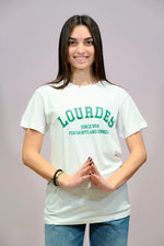 T-shirt girocollo "Lourdes" in cotone 100% con un trattamento agli enzimi che assicura una morbidezza eccezionale e una finitura di alta qualità. Il modello utilizzato è da uomo, per garantire una vestibilità più ampia e confortevole, perfetta per chi cerca un look rilassato senza rinunciare allo stile. Il colore verde dona un tocco fresco e versatile, ideale per ogni stagione.
